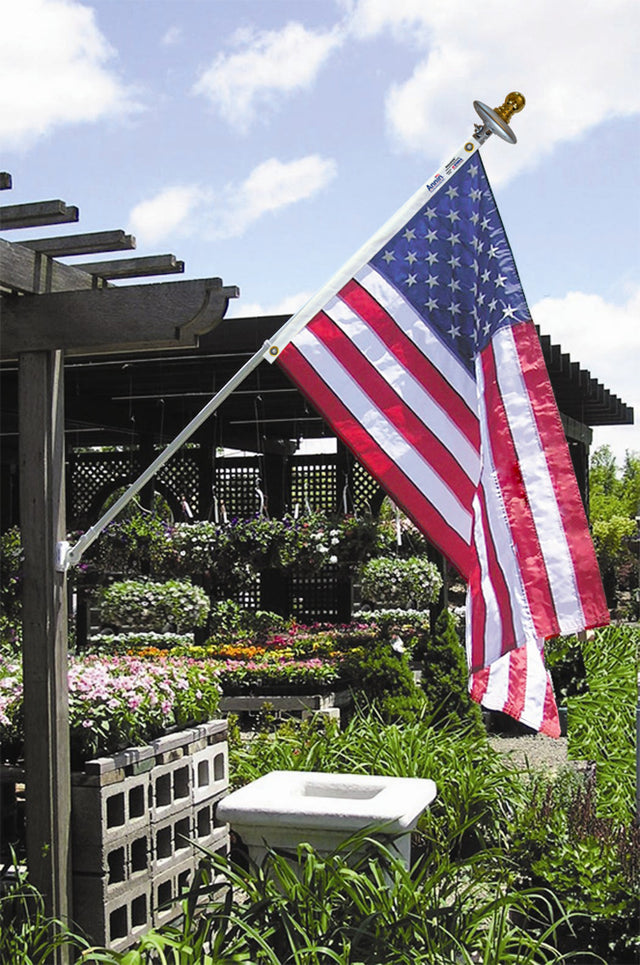 This set features a two- section white spinning pole with an angle-adjustable Solar Light, gold ball top and a 3x5 ft. SolarGuard Nylon American flag Made in USA. This American flag is expertly sewn using Annin’s heavyweight 200 Denier Nylon fabric. Stripes are sewn with four rows of stitching on the fly end hem and back tacked reinforcement. Vivid white stars are densely embroidered. Flag is finished with brass grommets.The Solar Light’s three LED lights illuminate the flag at night, while the top 40 inches of the flagpole rotates 360 degrees on ball bearings so your U.S. Flag will resist tangling. There is no need for an additional non-furling device. The mounting bracket is white cast-aluminum and fully-adjustable to multiple positions. Hardware is imported from China for Annin Flagmakers. This set makes an excellent gift for friends, parents or to PROUDLY display on your HOME. Mansion Flag Set 6 ft. Aluminum Spinner Pole that Rotates 360 Degrees, Includes a Solar Light and an American Flag 3x5 ft. SolarGuard Nylon by Annin Flagmakers, Model 42914 Deluxe nylon American Flag 100% Made in USA with richly embroidered stars and sewn stripes Solar Light Illuminates Flag at Night 6 ft. sturdy white aluminum non-tangle spinning pole Gleaming gold ball Multi-position, rustproof white aluminum bracket 026427429149