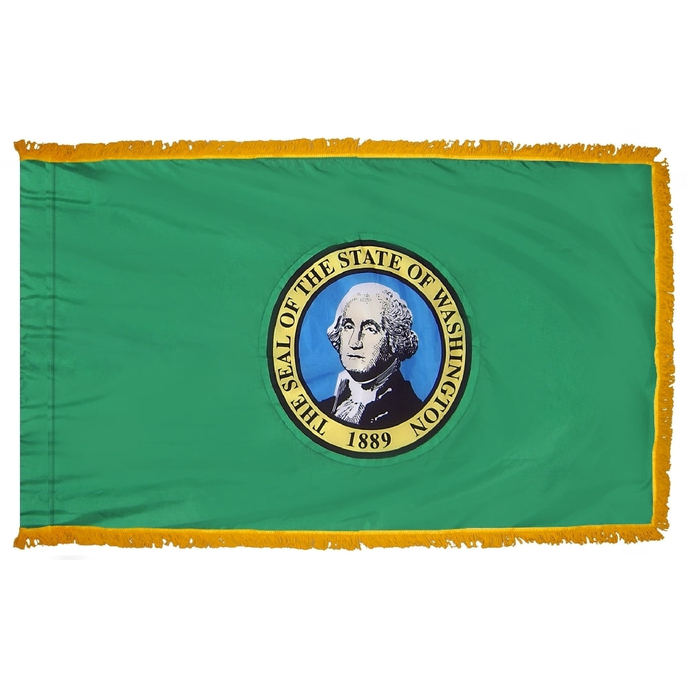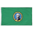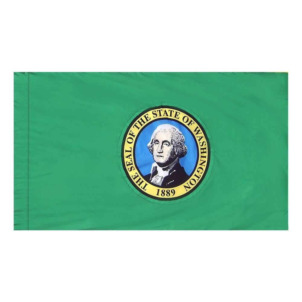 The Washington state Flag is unique for two reasons: it is the only Flag with a green field, and it is the only Flag with the image of an actual person. The state seal, George Washington's likeness, is centered on the green field. 1889 appears at the bottom rim of the seal, this being the year the seal was created by Charles Talcott. 100% Made in USA to Official State Design Specifications by Annin Flagmakers. Expertly printed and sewn using Annin's 200 denier nylon fabric with our exclusive SolarGuard™ dyes. Proven to last the longest and be the brightest. Durable fabric flies in the lightest breeze and blocks damaging UV rays. Finished with sturdy canvas heading and strong brass grommets.